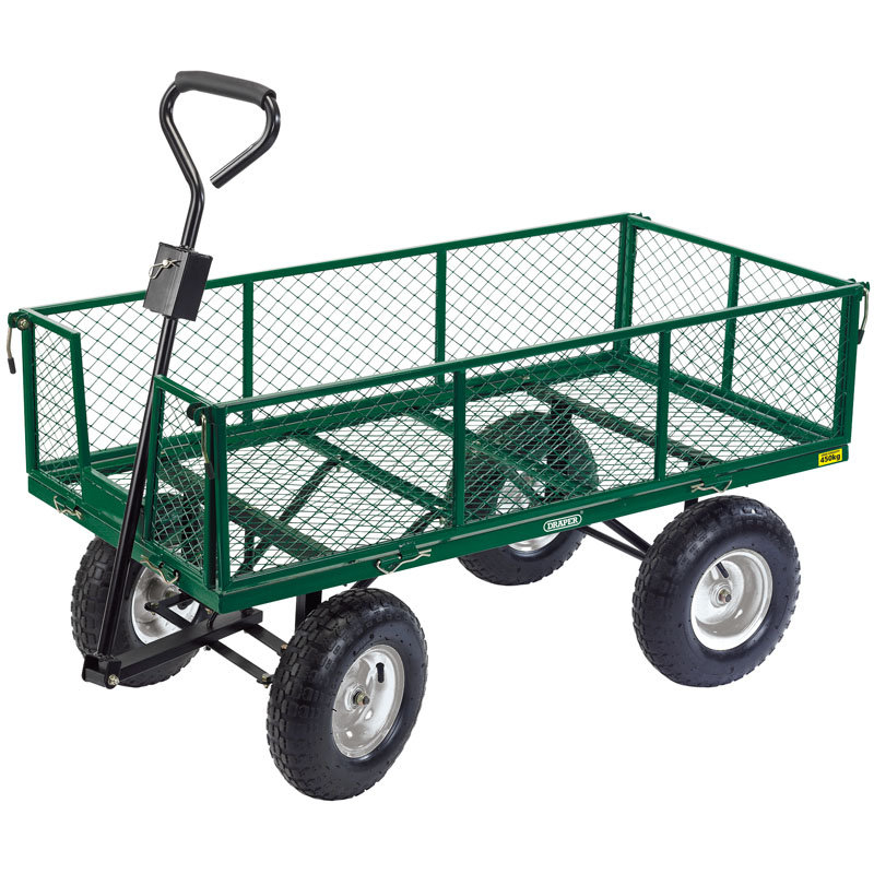 Steel fabricated cart with fold down sides, foam handle and heavy-duty pneumatic wheels. The handle on Stock No. 85634 easily converts for towing, making light work of moving heavy material. A heavy duty waterproof liner is available separately.